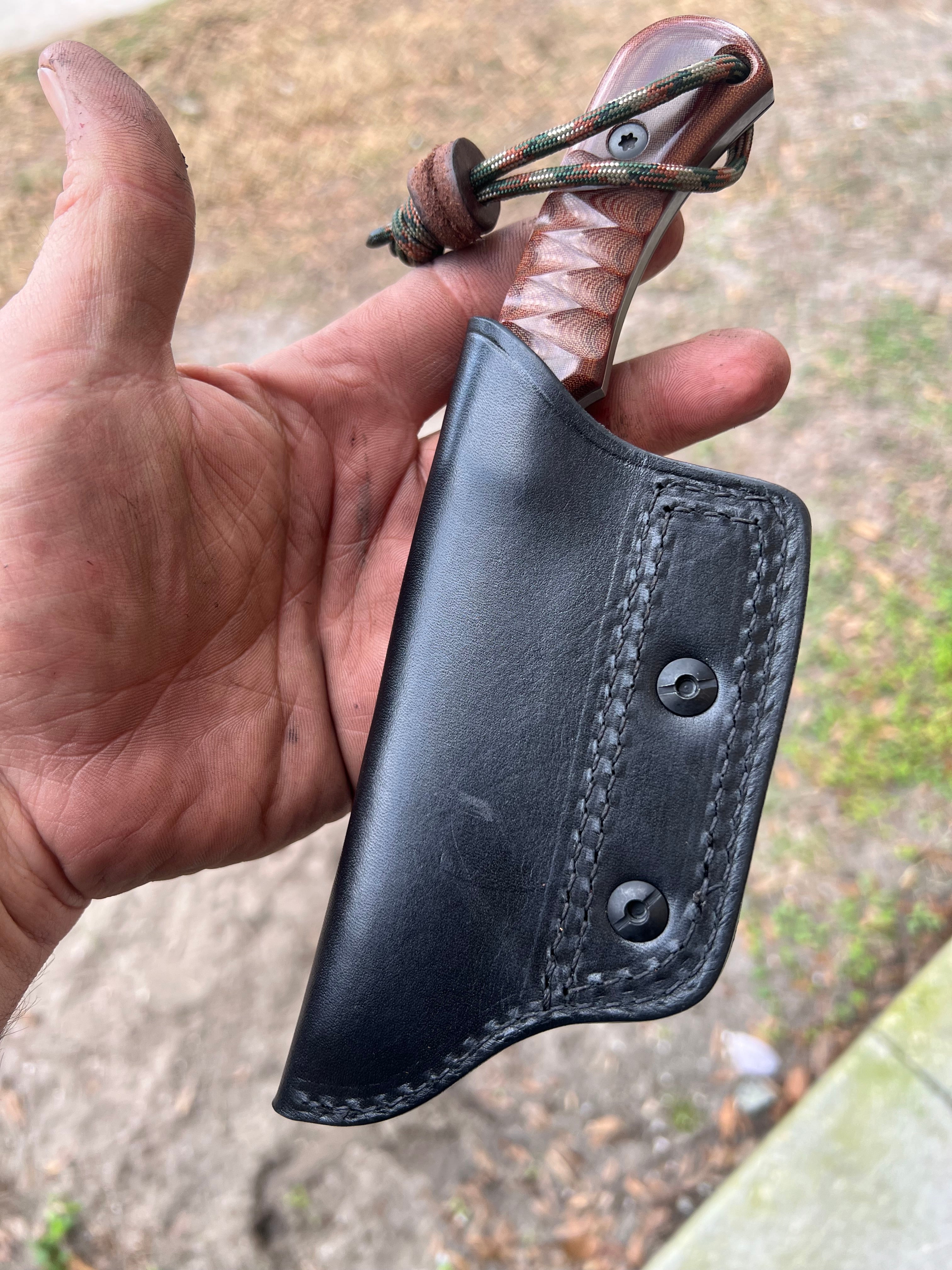 Available in multiple leather colors and stitching colors..Sheath and will be delivered flat and you can mold your knife to it after you put the knife in the first time for left or right hand draw.